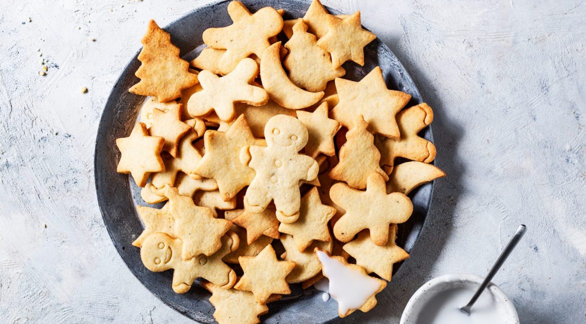 - Den Backofen auf 180 °C Ober-/Unterhitze vorheizen. 2 Bleche mit Backpapier belegen. Teig auf einer leicht bemehlten Arbeitsfläche portionsweise etwa 0,5 cm dünn ausrollen. Mit verschiedenen Förmchen Plätzchen ausstechen, diese auf die vorbereiteten Bleche legen und im heißen Ofen nacheinander in jeweils 10–12 Min. hellbraun backen.