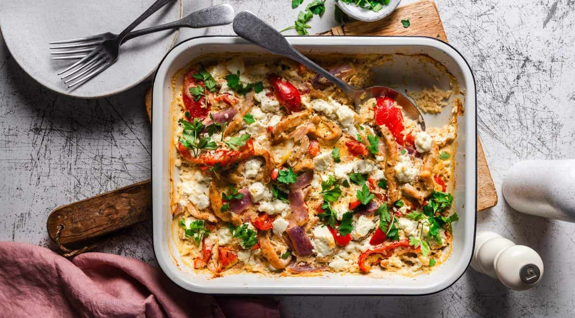 Feierabend und Lust auf Gyros vom Blech? Unser Feierabend-Gyros-Blech aus dem Ofen ist in nur 30 Minuten fertig: saftiges Geschnetzeltes, Paprika, rote Zwiebeln, Expressreis und cremiger Feta – dazu eine würzige Gyros-Soße aus dem Thermomix®. Das schnelle One-Pan-Ofenrezept spart Zeit, Abwasch und gelingt garantiert. Hier kommt das Rezept, lege direkt los – in 30 Minuten steht dein Gyros auf dem Tisch!