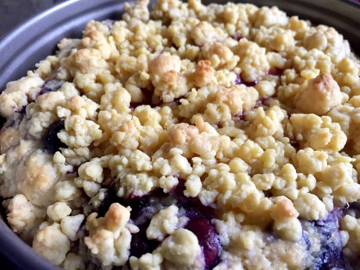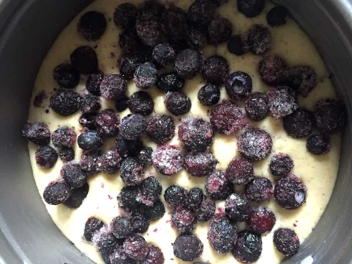 5. Teig in die vorbereitete Backform geben und glatt streichen. Die Heidelbeeren gleichmäßig darauf verteilen und dann mit den Streuseln bedecken.
